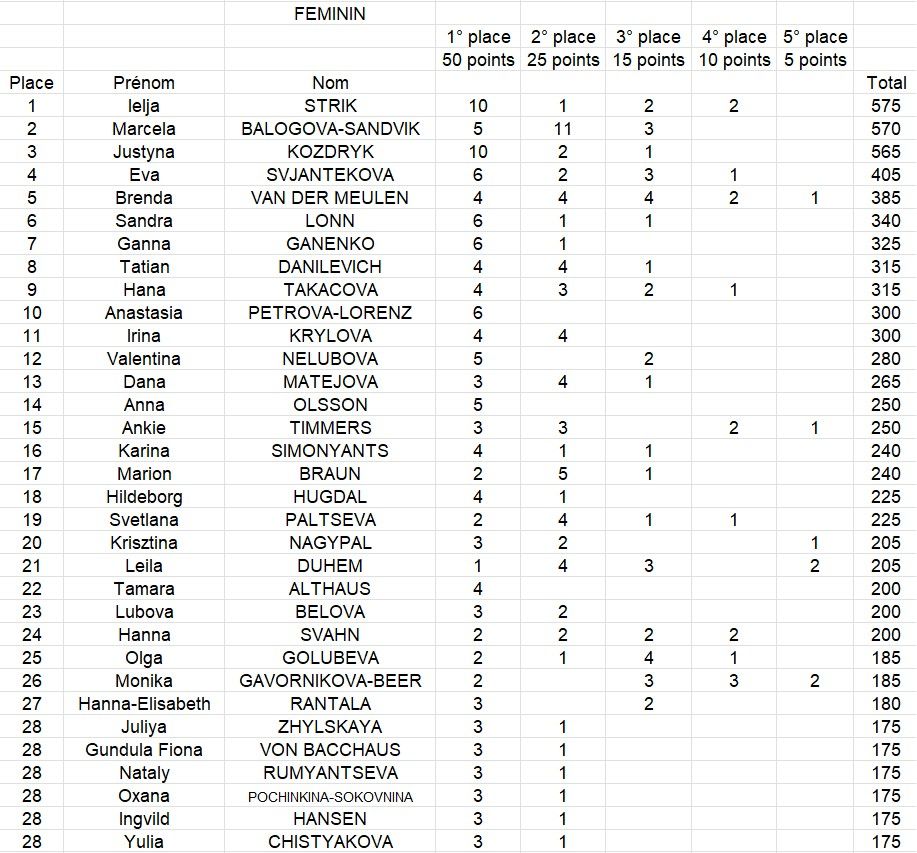 Chez les féminines, Ielja Strik avec 10 titres devant Marcela Sandvik et Justyna Kozdryk sont les premières ... La première française est 21° : Leila Duhem avec 8 podiums ! Chez les masculins, Jan Wiegera est en tête avec 14 titres, devant Kenneth Sandvik avec 8 titres et Dariusz Wszola avec 4 titres ... Le premier français est 6° : Alphonse Cucuzzella avec 4 titres !