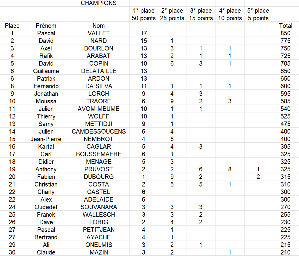 Chez les hommes : le premier est Pascal VALLET avec 17 titres