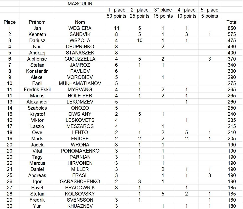 Chez les féminines, Ielja Strik avec 10 titres devant Marcela Sandvik et Justyna Kozdryk sont les premières ... La première française est 21° : Leila Duhem avec 8 podiums ! Chez les masculins, Jan Wiegera est en tête avec 14 titres, devant Kenneth Sandvik avec 8 titres et Dariusz Wszola avec 4 titres ... Le premier français est 6° : Alphonse Cucuzzella avec 4 titres !