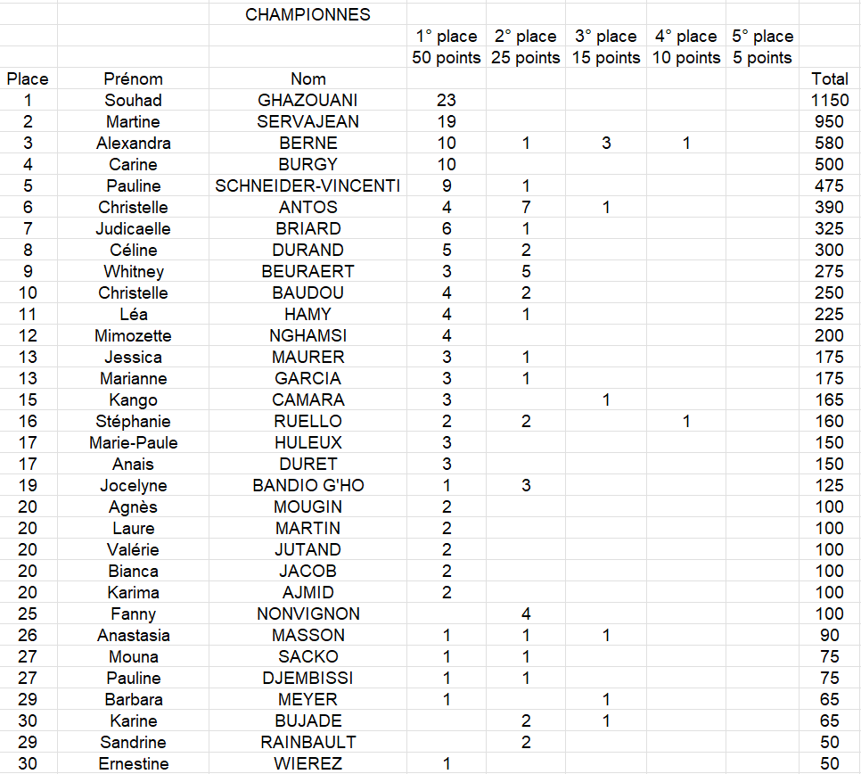 Chez les femmes : la première est Souhad GHAZOUANI avec 23 titres suivi de Martine SERVAJEAN avec 19 titres et Alexandra Berne avec 10 titres ...